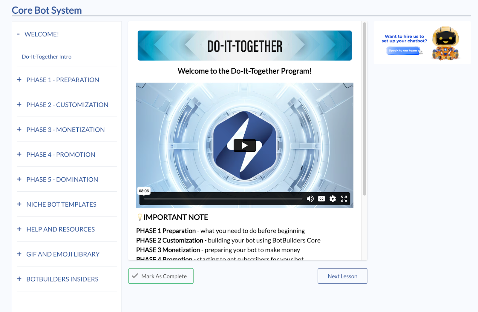 Your dashboard is the central hub for all BotBuilders training. Start by selecting a course from your library, follow the lessons in order, and use the “Next Lesson” and “Mark As Complete” buttons to track your progress.