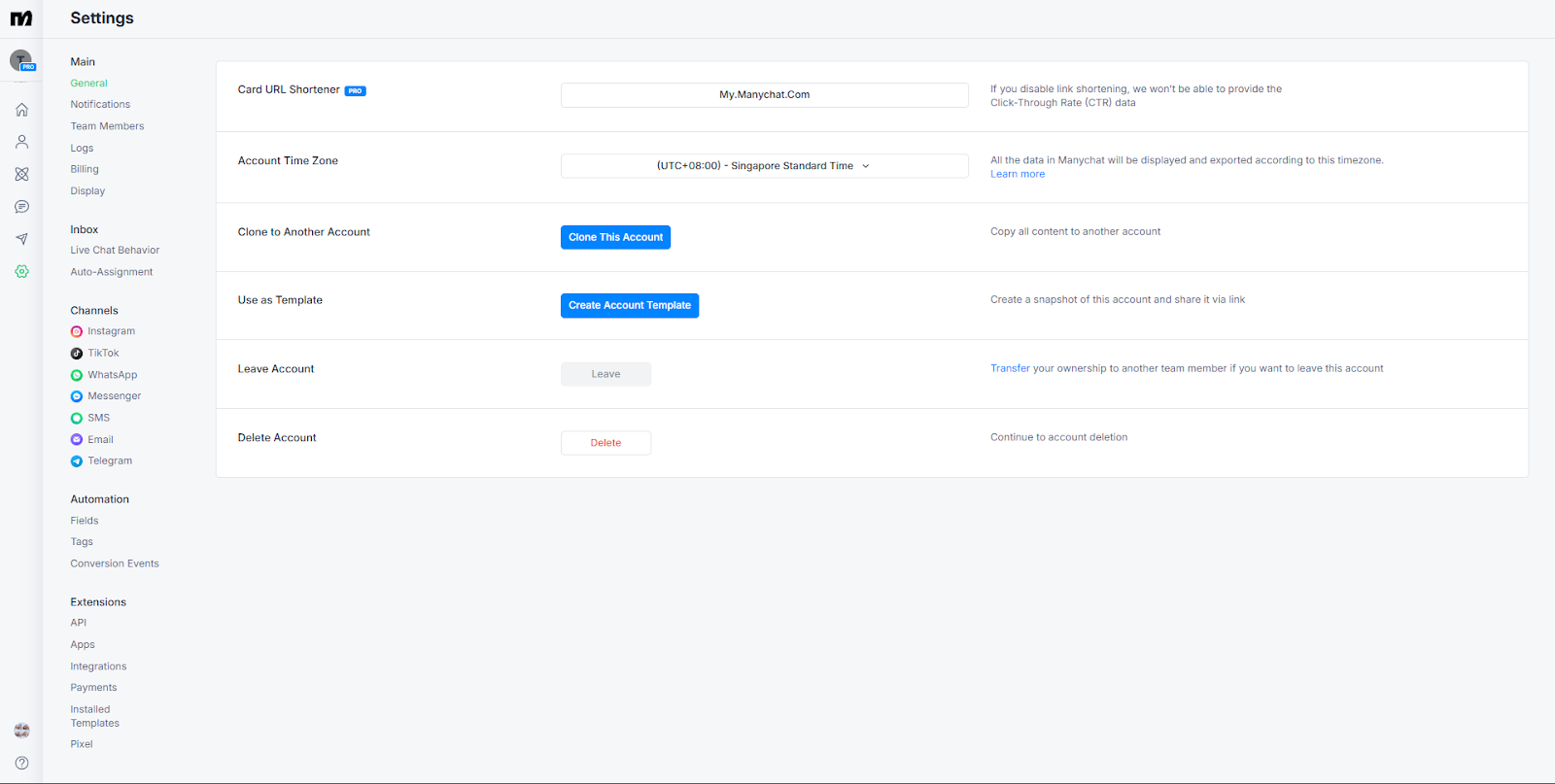 General – Business name, timezone, and profile settings.