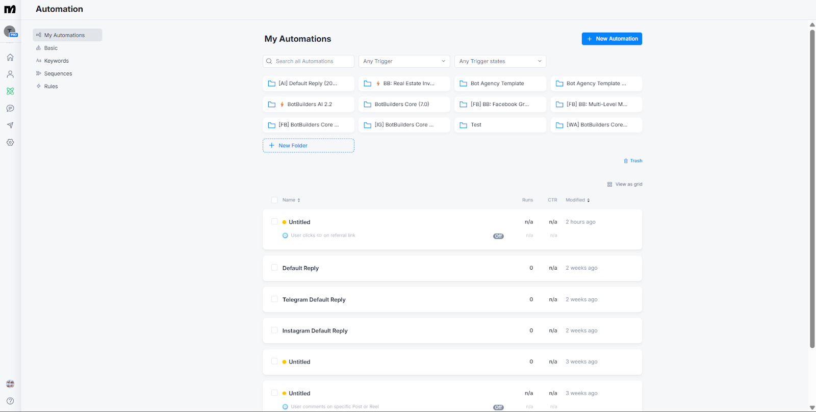 My Automations – All your installed flows, including the BotBuilders Core, AI 2.2, and any industry-specific templates you’ve added.